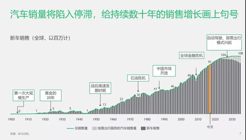 預(yù)測(cè),在2025年之前新車(chē)銷(xiāo)售還將繼續(xù)大幅增長(zhǎng),主要是受中國(guó)和其他發(fā)展中市場(chǎng)的推動(dòng)。但是在此之后,隨著中國(guó)銷(xiāo)量的增速減緩以及共享無(wú)人駕駛電動(dòng)汽車(chē)的普及加快,汽車(chē)銷(xiāo)量將陷入停滯,給持續(xù)數(shù)十年的銷(xiāo)量增長(zhǎng)畫(huà)上句號(hào)。