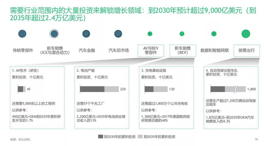據(jù)BCG預(yù)測(cè),為挖掘出行技術(shù)的潛在價(jià)值,行業(yè)參與者到2030年將需在新增長(zhǎng)領(lǐng)域投入超過(guò)9000億美元,到2035年則要超過(guò)2.4萬(wàn)億美元,重點(diǎn)投資領(lǐng)域包括自動(dòng)駕駛汽車(chē)技術(shù)、電池生產(chǎn)設(shè)施、充電基礎(chǔ)設(shè)施和自動(dòng)駕駛出租車(chē)隊(duì)。