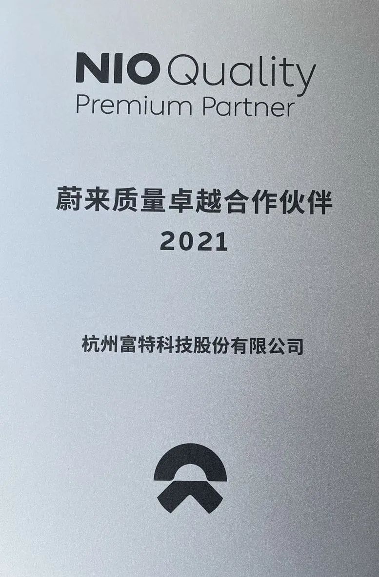 大會(huì)現(xiàn)場(chǎng),蔚來汽車執(zhí)行副總裁沈峰先生,親自為富特科技頒發(fā)了NIO Quality Premium Partner(NQPP蔚來質(zhì)量卓越合作伙伴獎(jiǎng)項(xiàng)),表達(dá)了對(duì)富特科技產(chǎn)品的巨大信任和肯定。