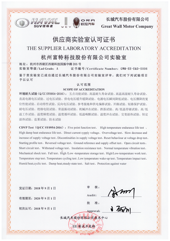 2018年9月,富特科技實(shí)驗(yàn)室迎來好消息,正式成為了長城汽車授權(quán)認(rèn)可的第二方實(shí)驗(yàn)室,獲得其環(huán)境耐久試驗(yàn)的授權(quán)。